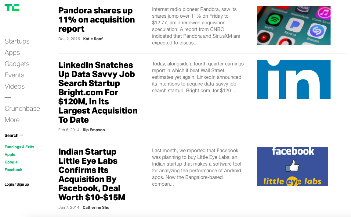 Just search “Mergers and Acquisitions” in Google News or “acquisition” in Techcrunch, and you’ll see tens of thousands of articles about how this company bought that startup.