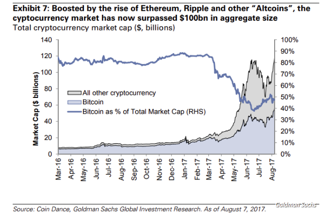 - Goldman Sachs reported that ICOs raised more capital for early stage companies in June and July than traditional VCs. Goldman dedicated two pages in it’s August 8th “Portfolio Tracker Toolkit” Report to Cryptocurrency. Most notable was this chart: