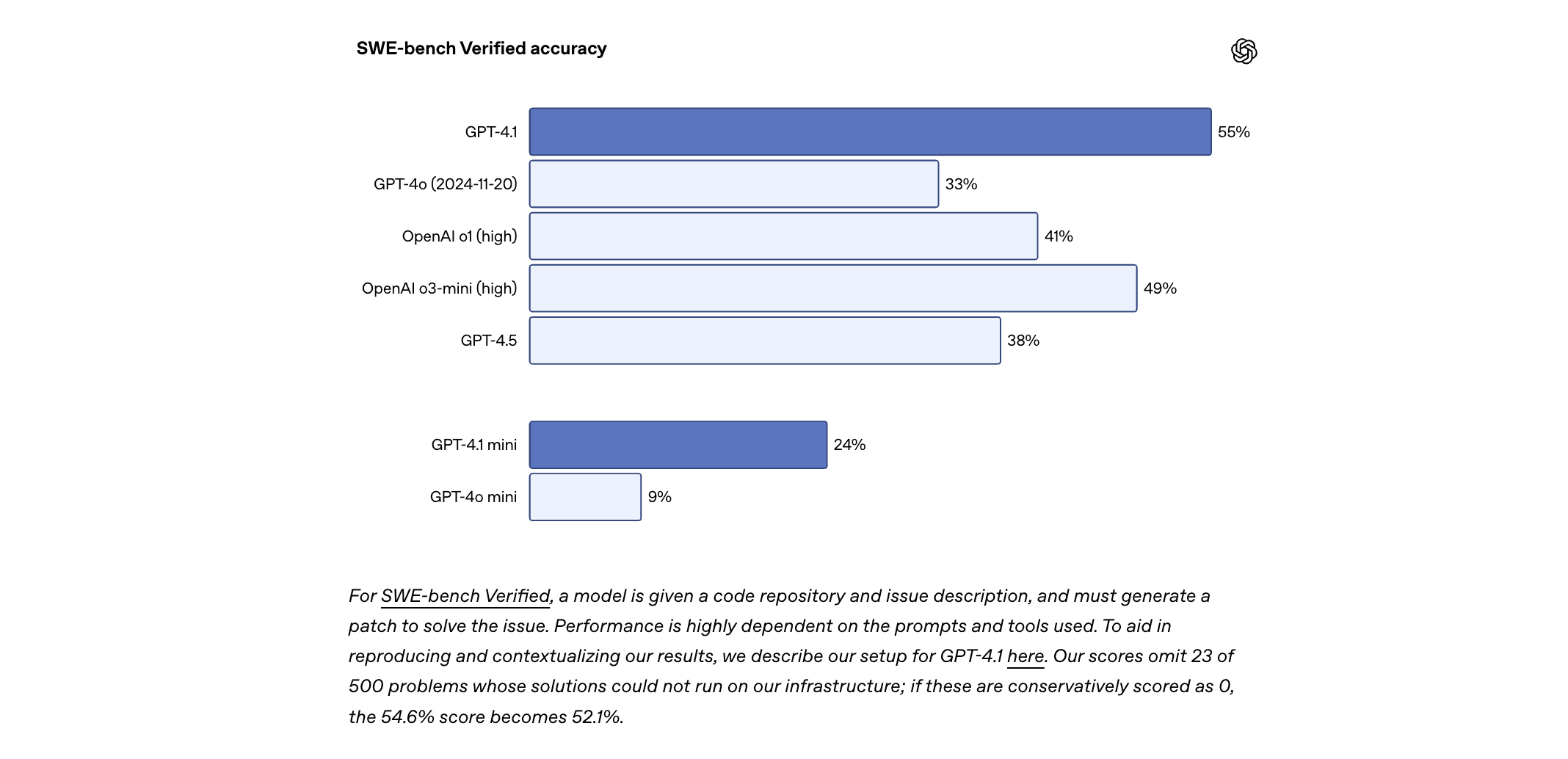 GPT-4.1 was recently released, and OpenAI disclosed its 54.6% score on SWE-bench Verified, improving by 21.4 percentage points over GPT‑4o and 26.6 percentage points over GPT‑4.5—making it a leading model for coding within OpenAI: