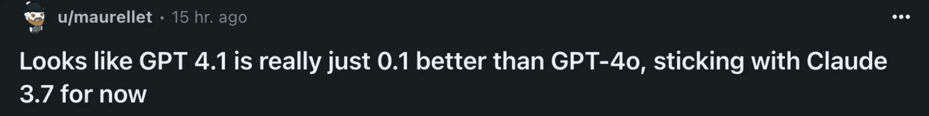 GPT-4.1’s release highlights confusion. There was a lot of hype around GPT-5 coming out, and after the disappointing results from GPT-4.5, OpenAI released 4.1. Why GPT-4.1? The move back toward 4.1 feels like a semantic step backward (GPT-4.1 vs. GPT-4o vs. GPT-4 Turbo—what’s going on here?).