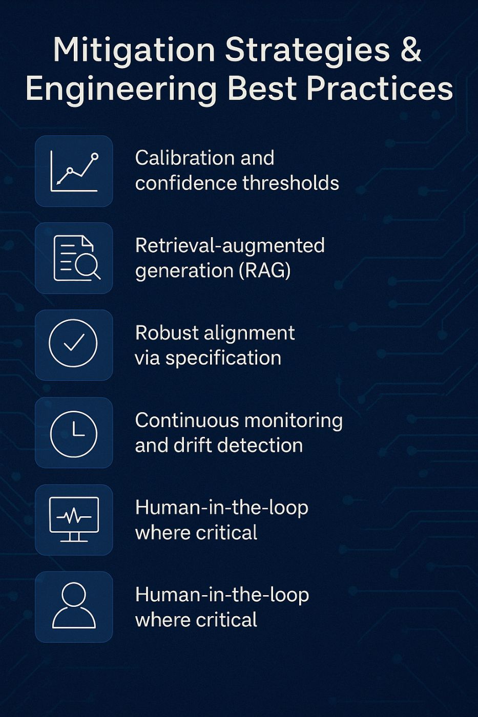 - Calibration and confidence thresholds: Log the model’s internal confidence; deploy fact‐check modules to catch hallucinations.