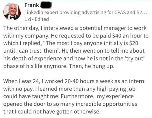 This privileged person wants you to believe that sacrificing your well-being and overworking while getting underpaid will take you to success. And, we will find several versions of this story on the platform. The user in this example is proud of their experience of working for free and belittles a managerial candidate for politely asking for fair compensation for his/her work. And, can we even corroborate his story? How many 24-year-olds have the luxury to work 40 hours a week while not getting any financial compensation?