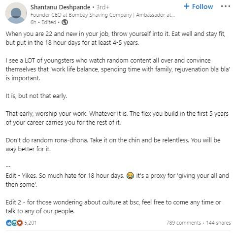 Moreover, the constant promotion of working hard and hustling to the limits takes a heavy toll on mental and physical health. It creates a fear of missing out and can lead to burnout and other mental health issues. Here’s a CEO asking young people with white-collar jobs to