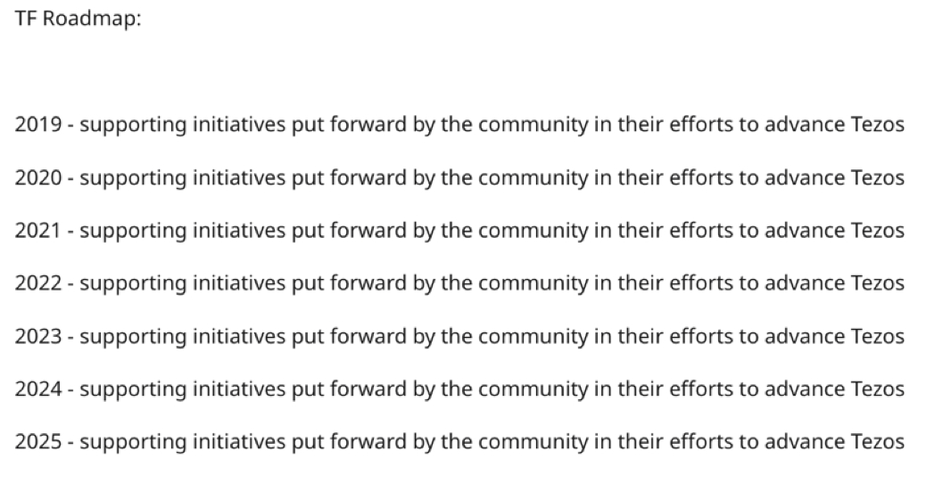 Since a large number of organisations are working on the further development of Tezos and submit applications for funding, there is no explicit roadmap. The Foundation responds to applications and suggestions instead of giving guidelines on what development one would like to see.
