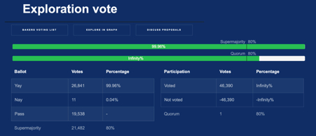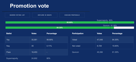 During the initial exploration phase, the bakers can vote with Yes (Yay), No (Nay) or Abstention (Pass). In order for the proposal or change that was voted on to be successful and for the project to move into the exploration phase, at least 81.39 percent of the Bakers must have voted in order for the quorum to be reached. Of those who voted yes or no, at least 80% must have voted yes. This is called supermajority.
