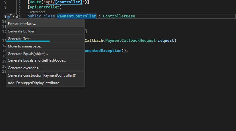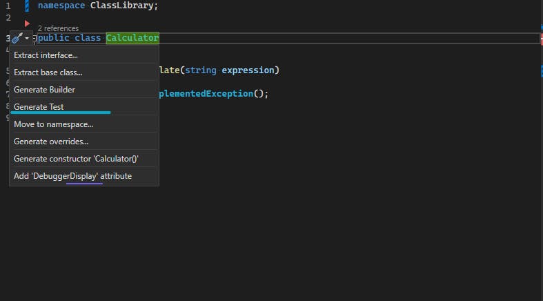 Let's use EasyTdd to generate the test. Click on the "Quick action" icon or press Ctrl+. to access the quick action menu. Choose "Generate Test."