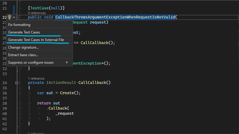Now, I will utilize the EasyTdd feature, "Generate Test Cases in External File":