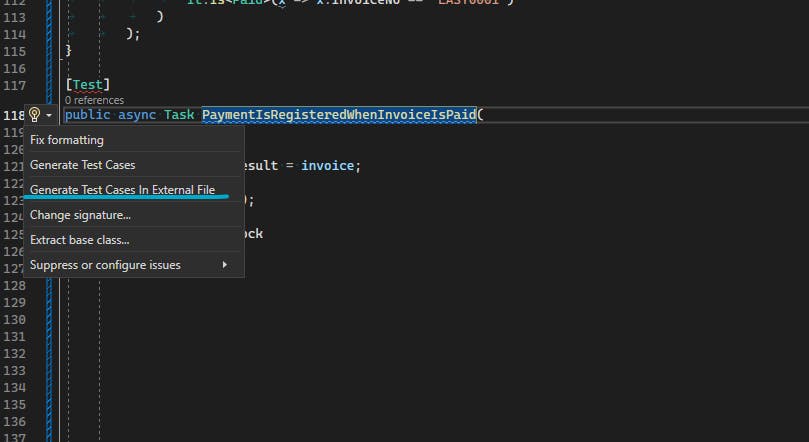 This action generates a PaymentIsRegisteredWhenInvoiceIsPaidCases file, where I can include all the cases when RegisterPaymentAsync needs to be called: