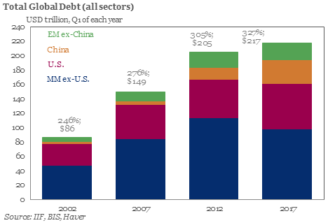 Zero Hedge reports that global debt now stands at a record high $217 trillion dollars, more than 327% of GDP. Yes, that is trillion with a capital T. That’s a lot of unpaid bills and a lot of cans kicked down the road.
