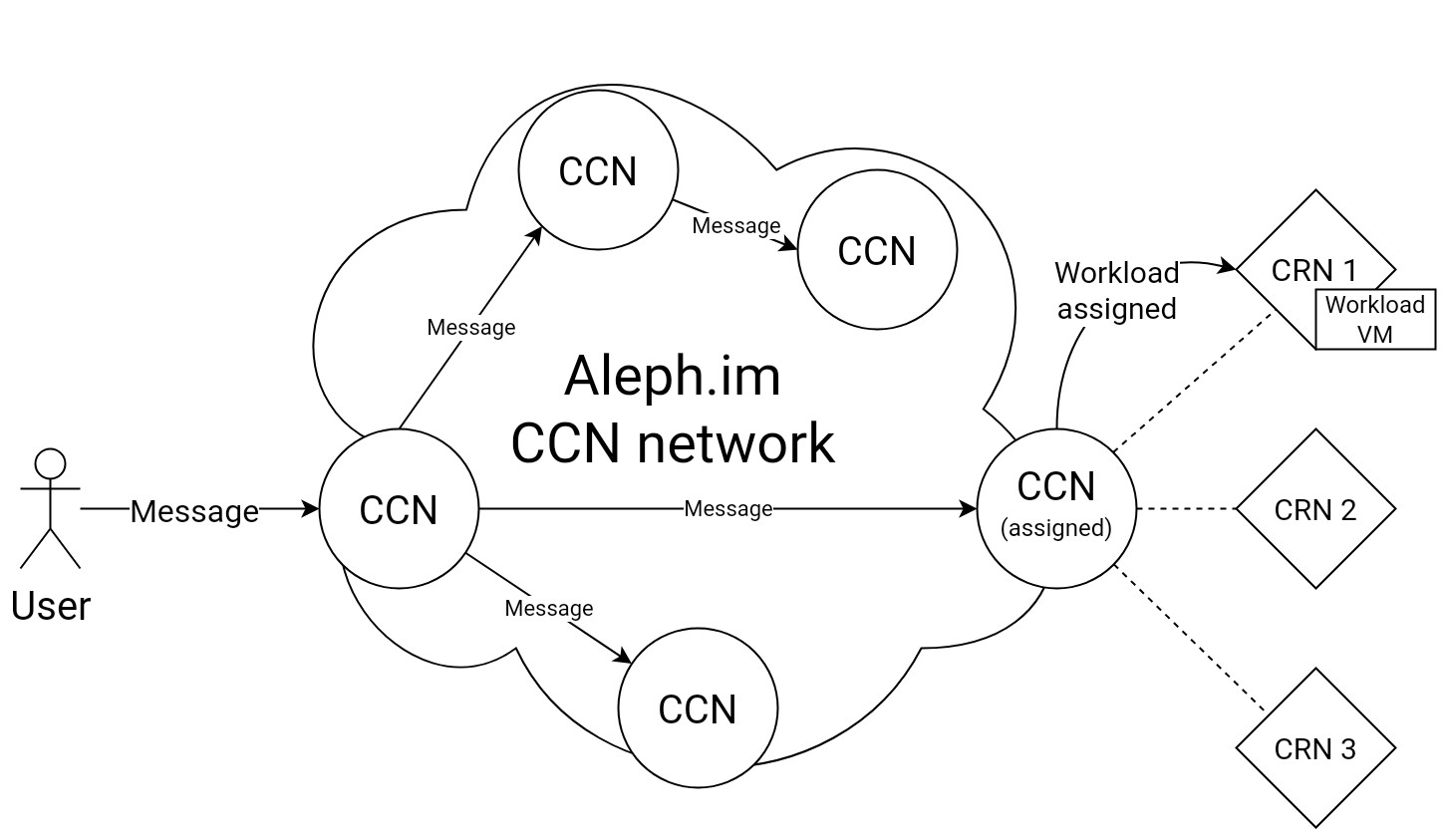 - The Aleph peer-to-peer network, comprised of Compute Resource Nodes or CRNs and Core Channel Nodes, or CCNs