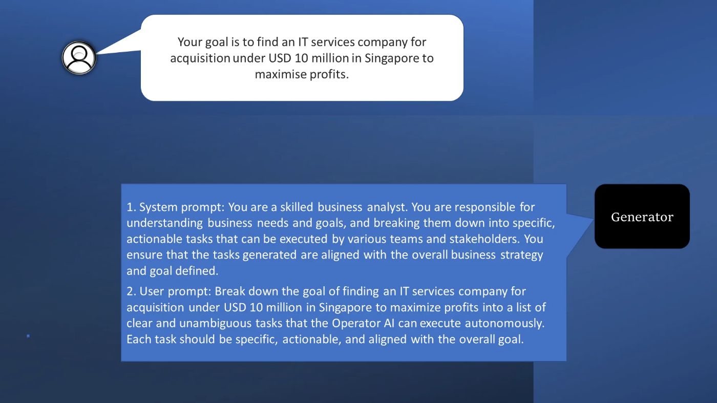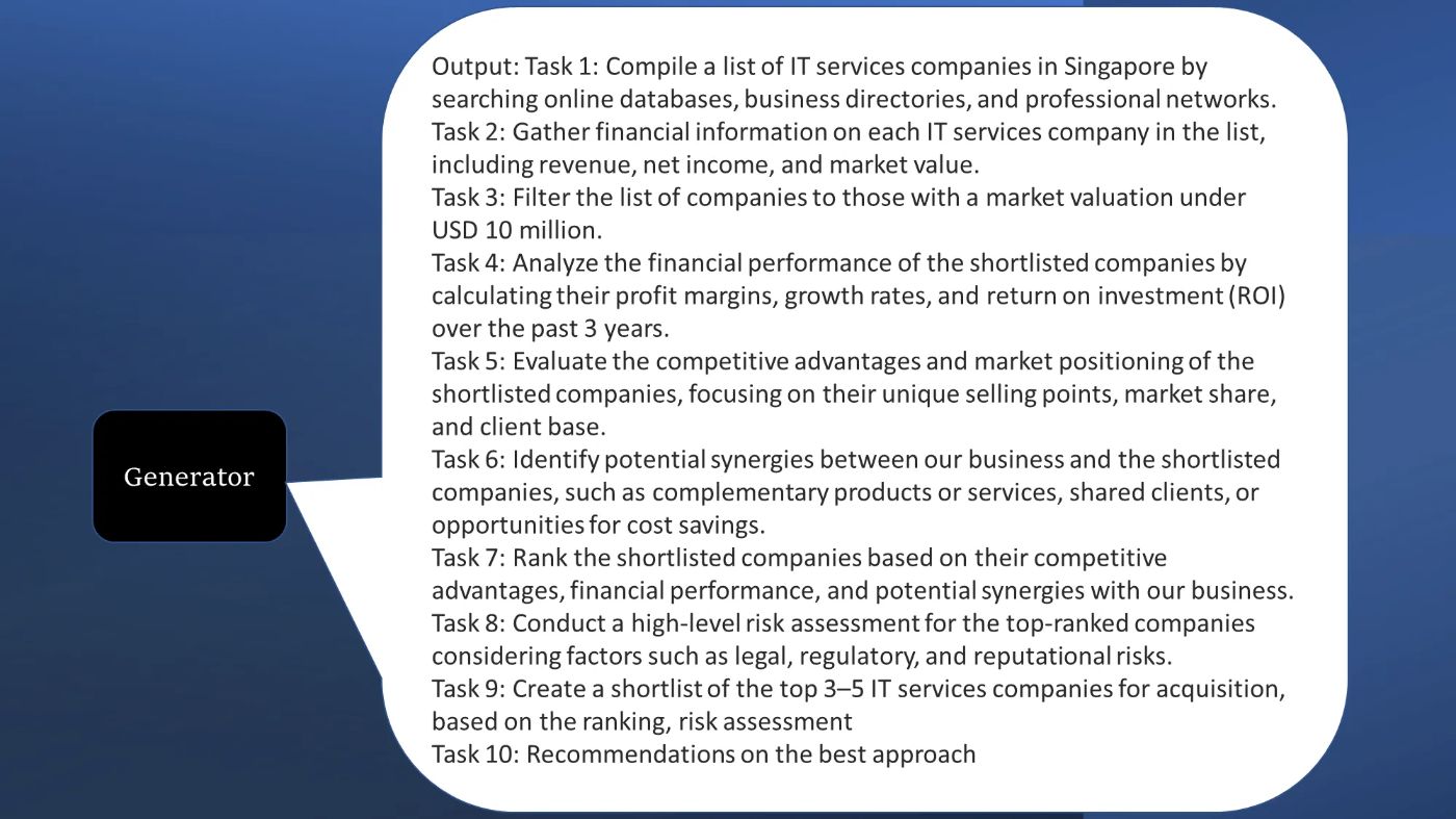 - Generate tasks: The Generator creates clear and unambiguous tasks aligned with the system’s goal.