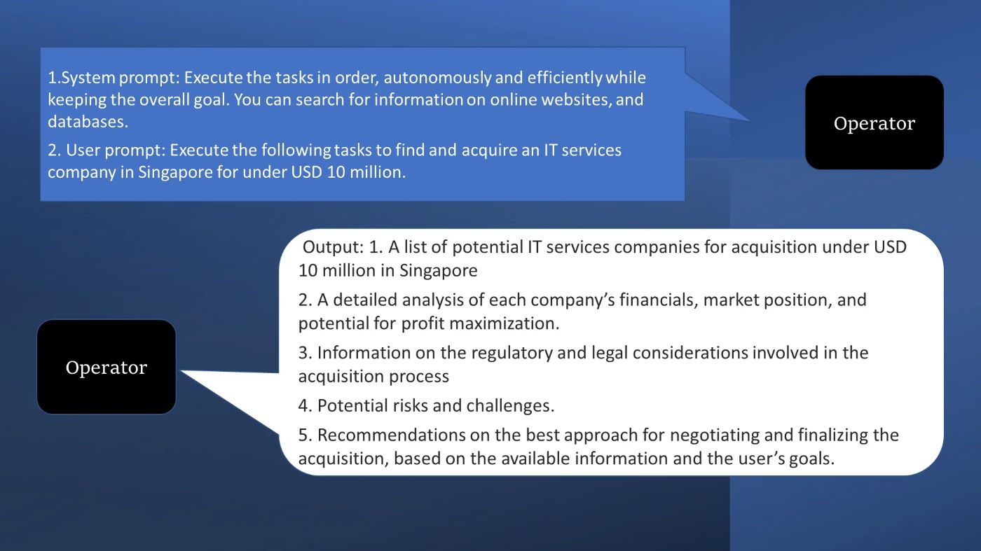 - Operator execute tasks: The Operator autonomously and efficiently executes tasks, potentially replicating itself to perform tasks in parallel.