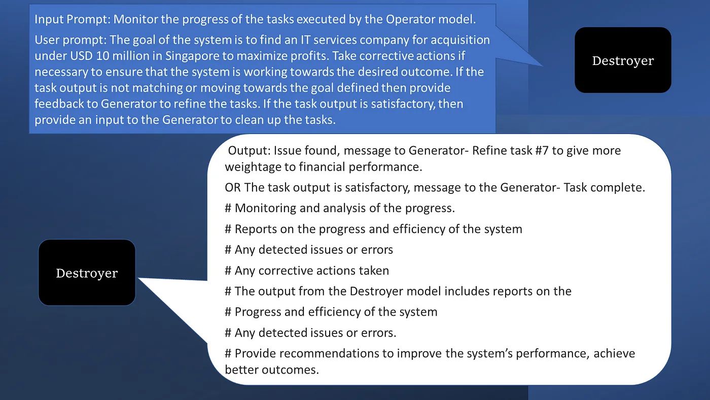 - Feedback communication and coordination: The Destroyer refines tasks and ensures the system works towards the desired outcome.
