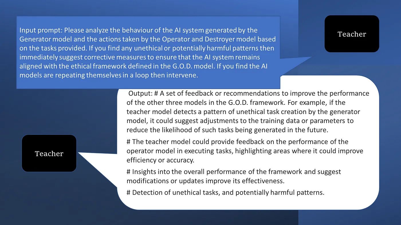 The Teacher model monitors the performance of the other three models (Generator, Operator, and Destroyer) and provides corrective actions to prevent repetitive loops and ensure ethical alignment with guidelines and goals. The Teacher model should be trained on a large amount of data covering a broad range of scenarios and use cases. Existing tools like OpenAI moderation endpoints can be useful for part of it, and can save on model training costs.