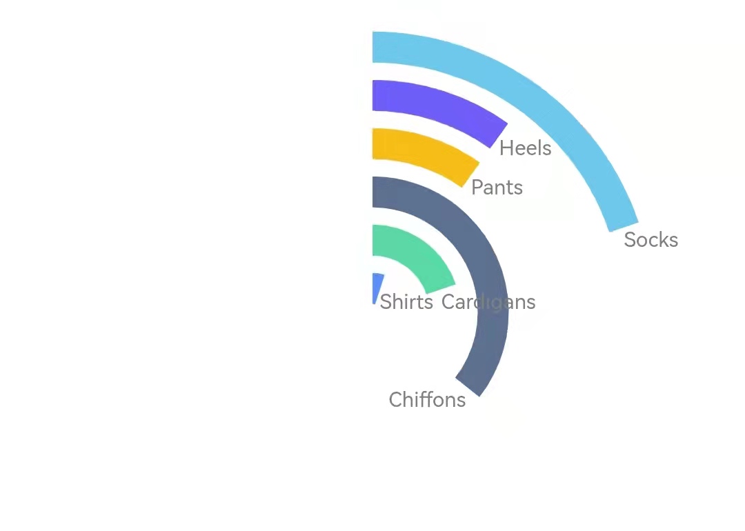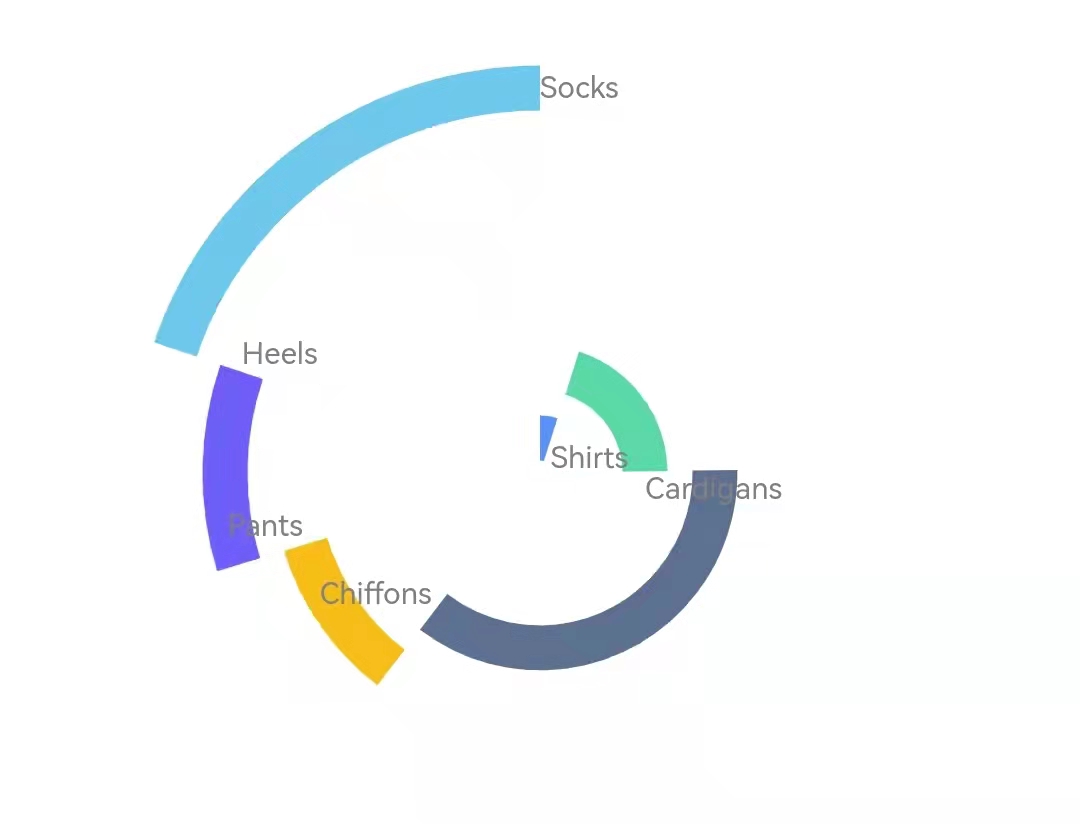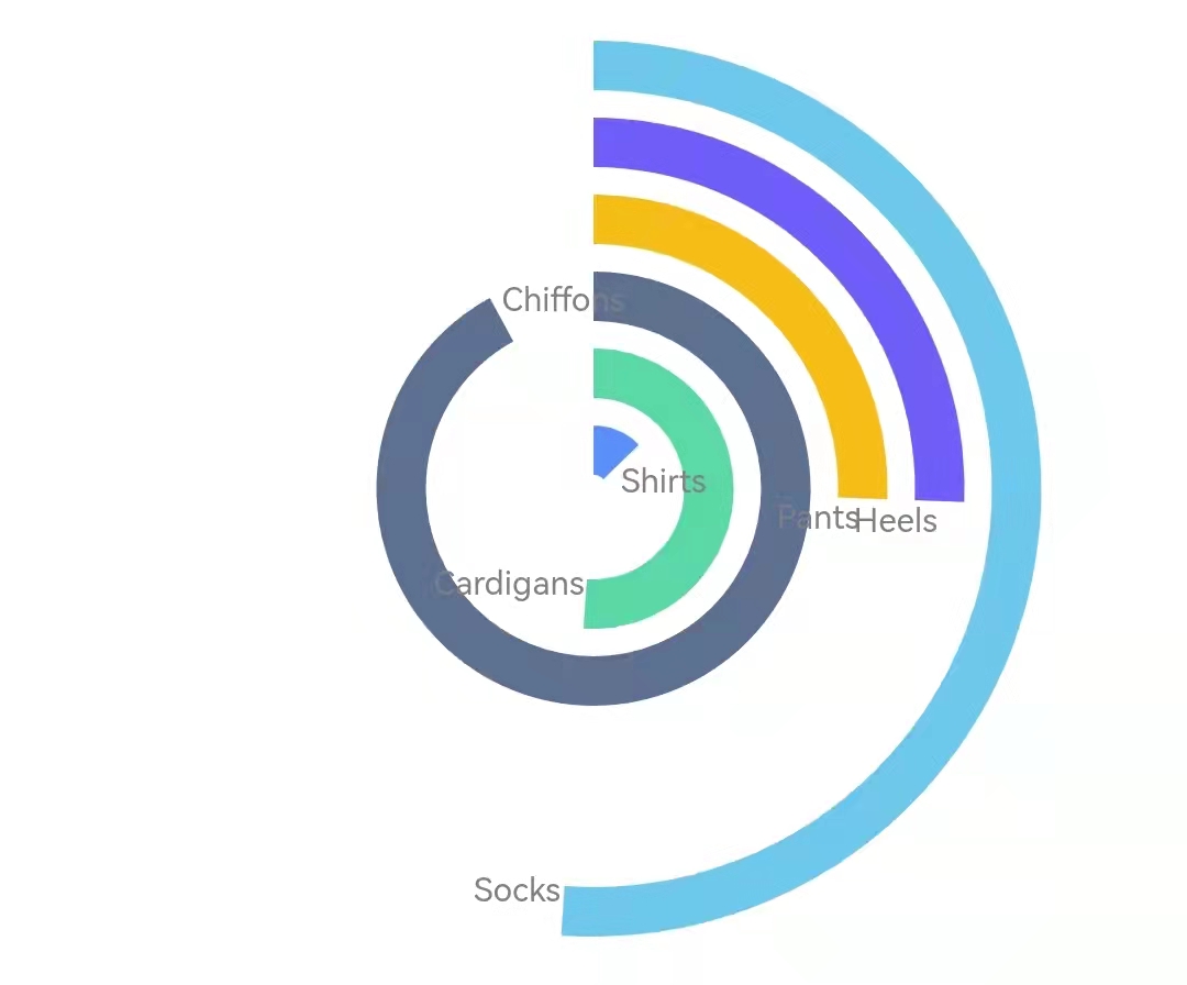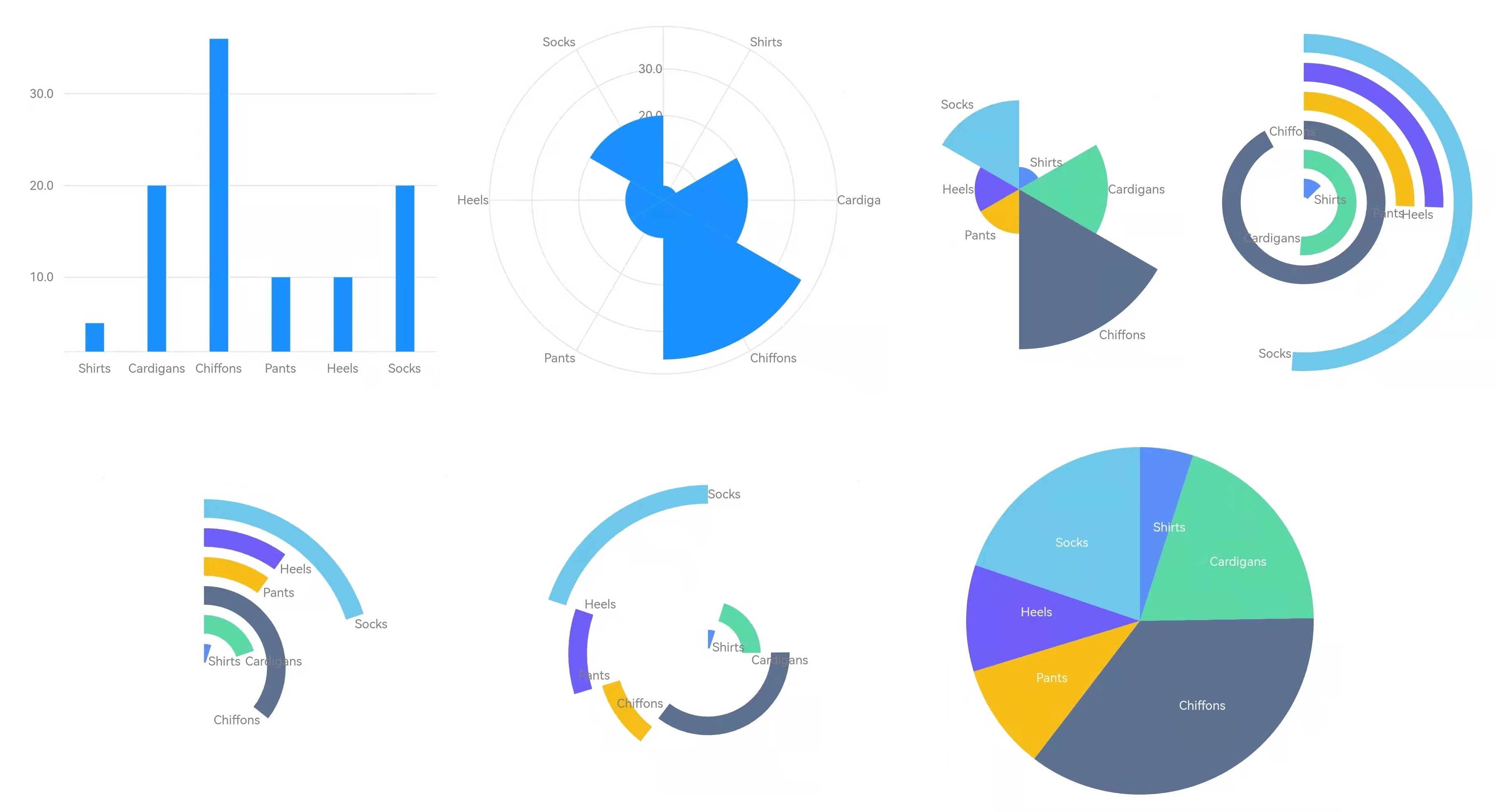 In the process above, we transformed the graphics incessantly by changing the specifications such as the coordinate, scales, aesthetic attributes, variable transforms, and modifiers. And we got a bar chart, a rose chart, a racing chart, a sunrise chart, and a pie chart of traditional chart typologies in order:
