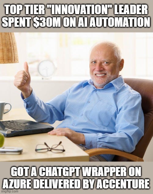 - The “Big 5” Tax: Companies are tired of paying Accenture or Deloitte millions for ChatGPT wrappers that yield zero ROI. These legacy fixers are currently knocking on the doors of builders, asking to subcontract the work they promised their clients for 10% of the deal. They cannot do it themselves.