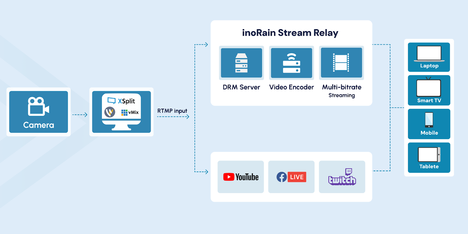 Software multistreaming means your PC handles everything directly. Hardware means an external encoder takes the load off your machine. Cloud relay is different — instead of your computer sending streams to multiple platforms, you send one stream to a cloud-based service, and that service distributes it to all your platforms. There are companies that specialize in exactly this, handling the heavy lifting on their end so your upload speed and CPU aren't stretched thin trying to push to five destinations at once. inoRain is one of those platforms, built specifically for multistreaming and OTT distribution at scale.