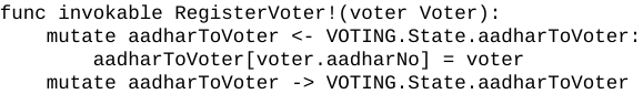 Also, here’s the syntax of a ‘function’ in an MOI logic, where a voter can be registered by providing all fields in the voter class: