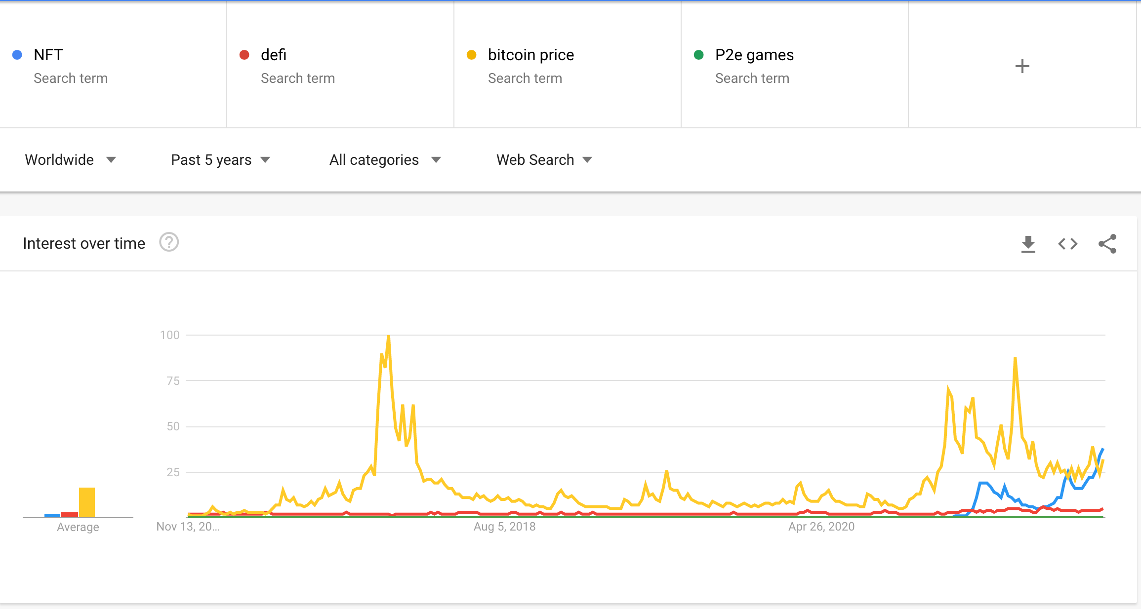 While the last few years have seen scorching growth in cryptocurrency adoption, most of the mainstream attention and participation has been around speculative trading with different crypto tokens. This is illustrated by the Google Search trend comparison shared below.