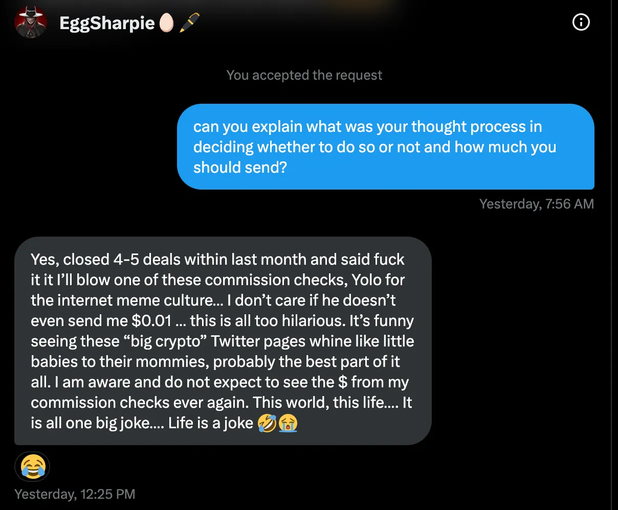 So I thought that the fastest way to find out was speaking to those who had sent money to Pauly. Shot a tweet, and people reached out, confirming that they sent crypto to yougetnothing.eth (some multiple times) and explained their reasoning behind it.
