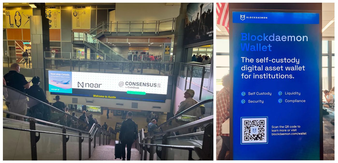 Blockchain infrastructure platform, Blockdaemon, bought a massive Digital Out-Of-Home (DOOH) takeover at the AUS arrivals gate. And application platform, Near Protocol, had several digital banners next to high-traffic departure gates. (Pics below)
