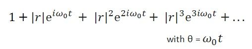 Now let radius R = 1, and take |r| e^(-iθ) to be the common ratio of a geometric series with r being a complex number, |r| < 1 and first term