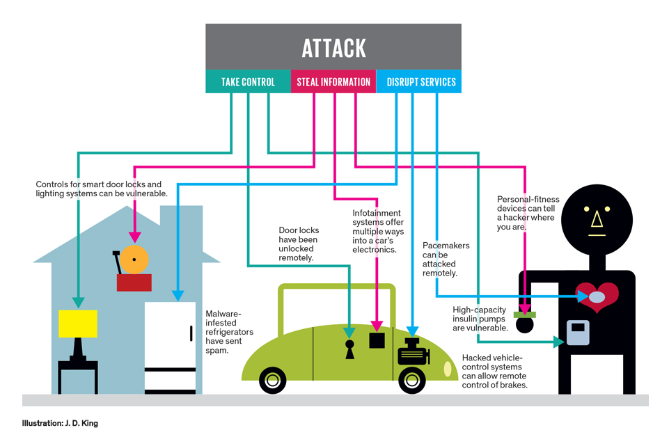 No Place To Hide: With the Internet of Things spreading throughout our homes, cars, and even bodies, new vulnerabilities seem to emerge almost daily. The smart locks and security systems in your home could be disabled by a would-be burglar. Your car could be forced to unlock its doors and start its engines; a thief would only have to get in and drive. Implanted pacemakers and insulin pumps are also vulnerable to hacking.