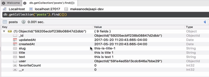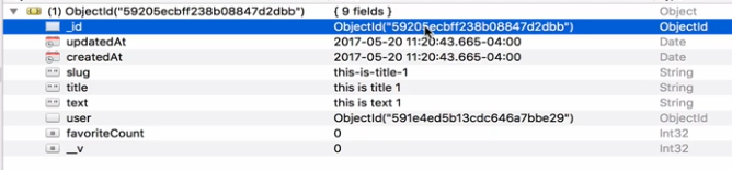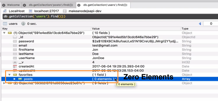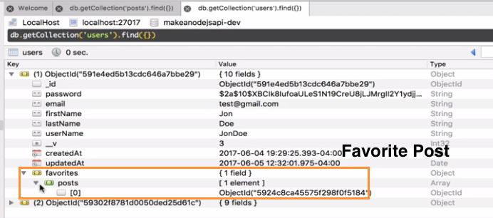 We only kept the object ID because this will save us from replicating the data. If you hit the same API again, you will see something strange, that the Post ID is now removed from the favorites in user model!