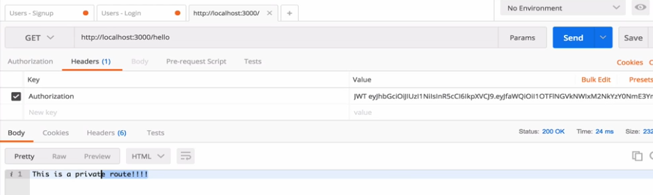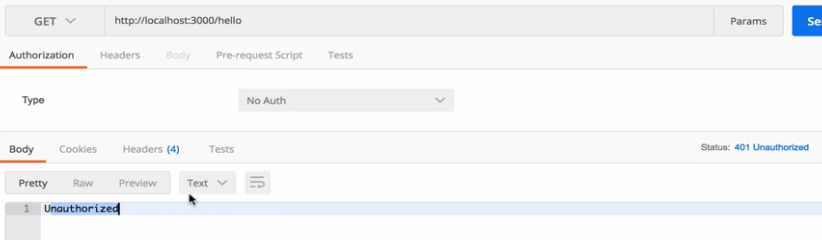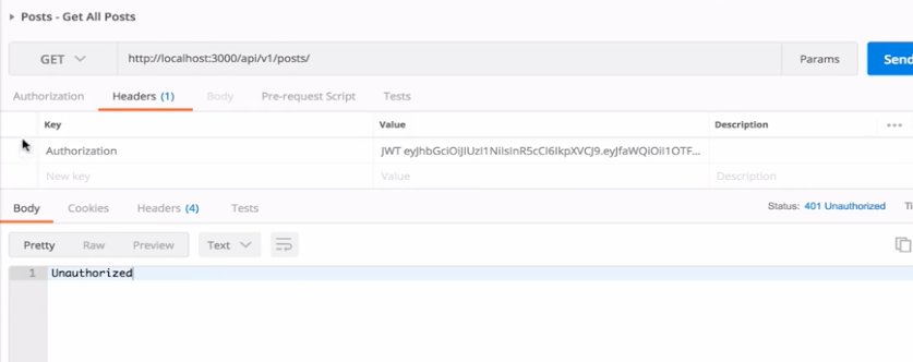 We just added authJwt in these two existing lines. Once this is done, if I try to get Post list without Authorization header, we will get an error:
