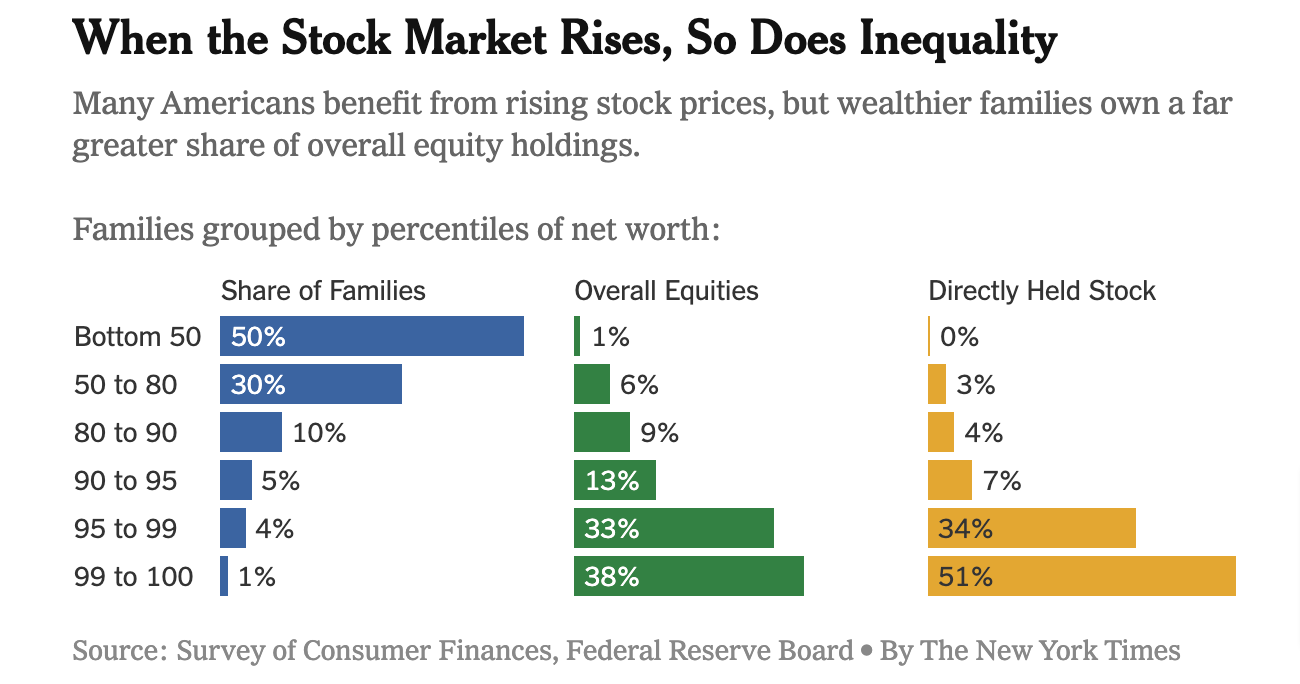 “Ownership of stock is concentrated among those with higher incomes. That is hardly a surprise as investing in stocks or mutual funds requires money. Some 92% of those in the top 10% of the income ladder owned stock in 2019 compared to 56% of those considered middle class. When it comes to owning stocks directly, families in the top 10% of earnings accounted for 44% compared to only 12% of the middle class and 5% of those in the bottom quintile. - U.S. News and World Report