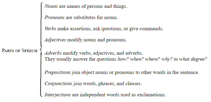 In the preceding chapters we have seen words as they are used singly. We studied their pronunciation and the way in which they were formed to express a definite meaning. In this chapter we shall begin a review of grammar, a study of words not according to their pronunciation or their definition, but according to their use as they are arranged with other words to express complete ideas. The simplest group into which words are thus arranged is the sentence, consisting of two important parts, the subject and the predicate. The subject is the part about which something is told, and the predicate is the part that tells about the subject; as,