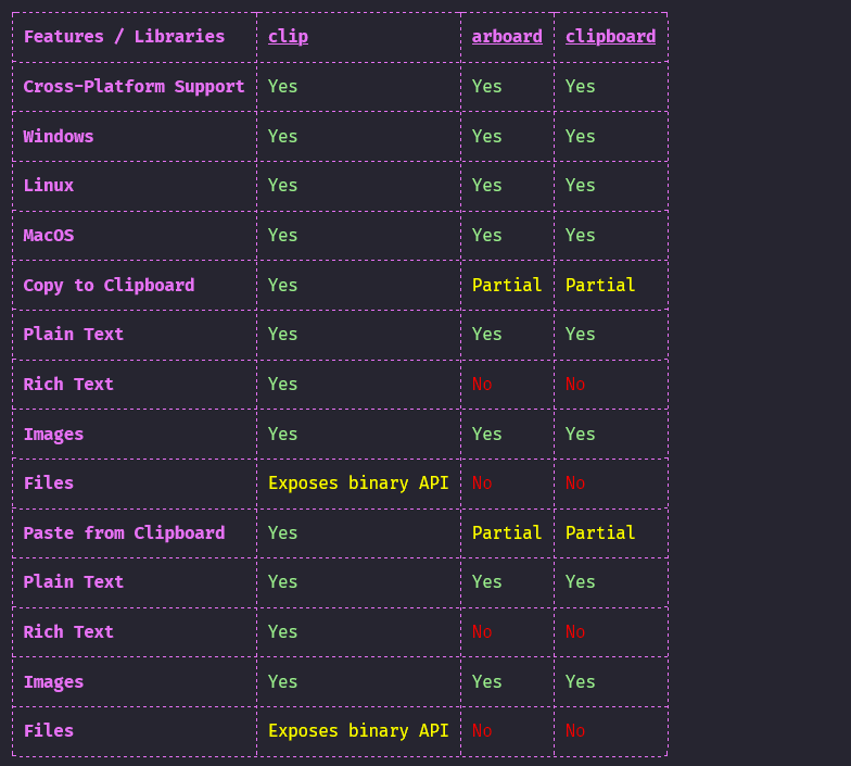 The simplest clipboard library would let us query the clipboard directly for binary data. This approach would require us to a parser per format per operating system. While such libraries deserve a place in this world, they are not helpful for most applications. Most applications want to handle copying and pasting only for text, rich text, images, and sometimes files. Let's go through the different clipboard management libraries and see how they fare.