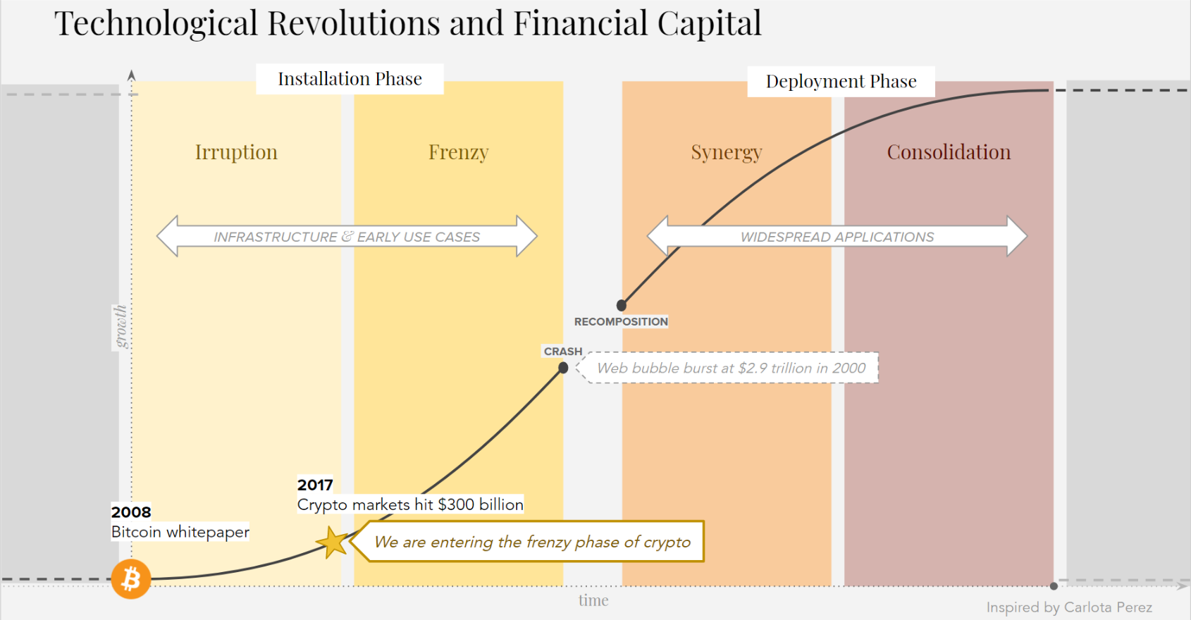 The market cap is only about 5% of the way to the same market cap as the Web bubble when it popped in 2000. Just entering the Frenzy stage according to the Perez model.