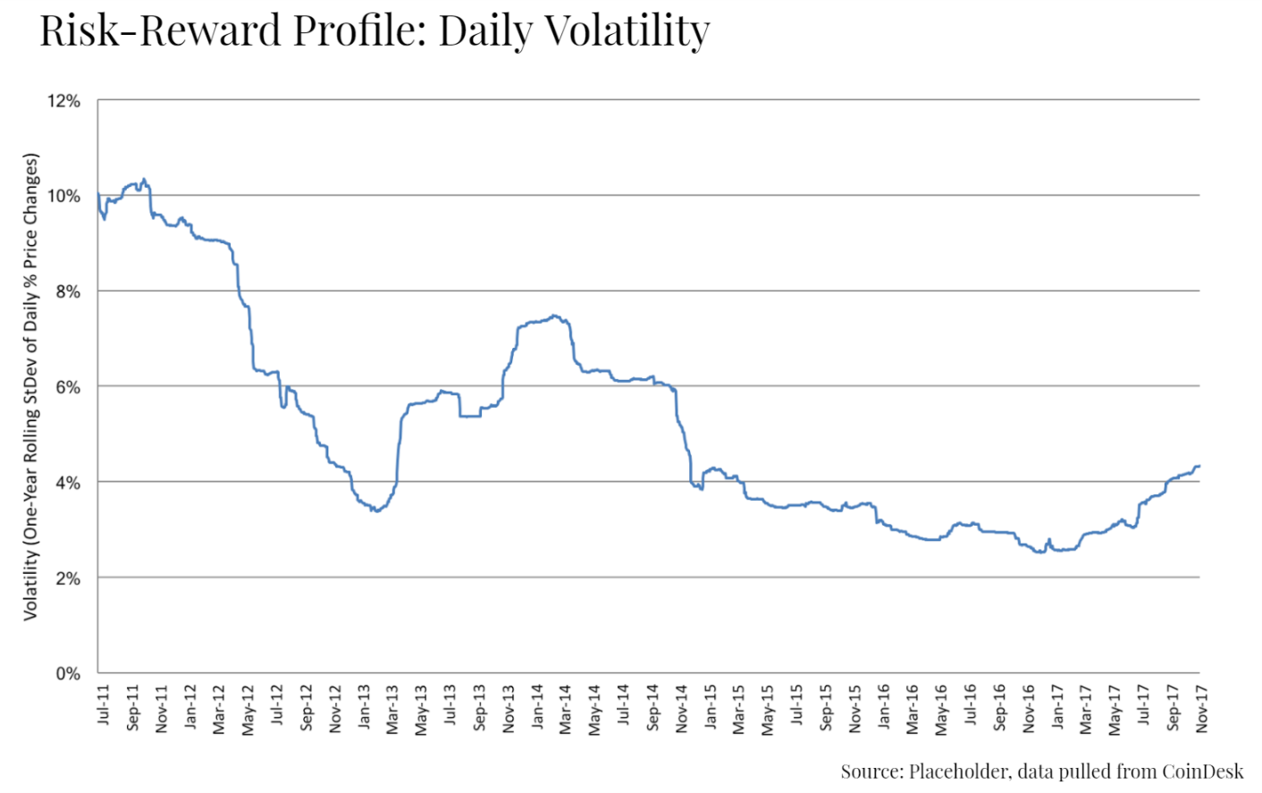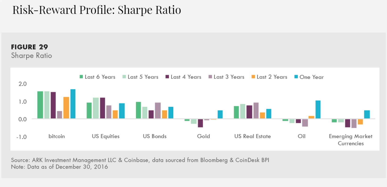 4.b. Sharpe Ratio — Bitcoin’s absolute returns are decreasing but so is volatility. Sharpe ratio (a measure of return/volatility) in 2016 was roughly same as 2011 (meaning that over time both the amount of appreciation and volatility are decreasing)