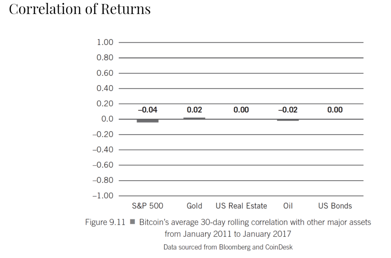 3. Correlation of Returns — bitcoin is highly uncorrelated with existing asset classes. This is largely a function of how young and new it is. It’s likely that Bitcoin and gold both “popped” around Trump and Brexit when equities futures crashed suggests Bitcoin will likely correlate with gold.