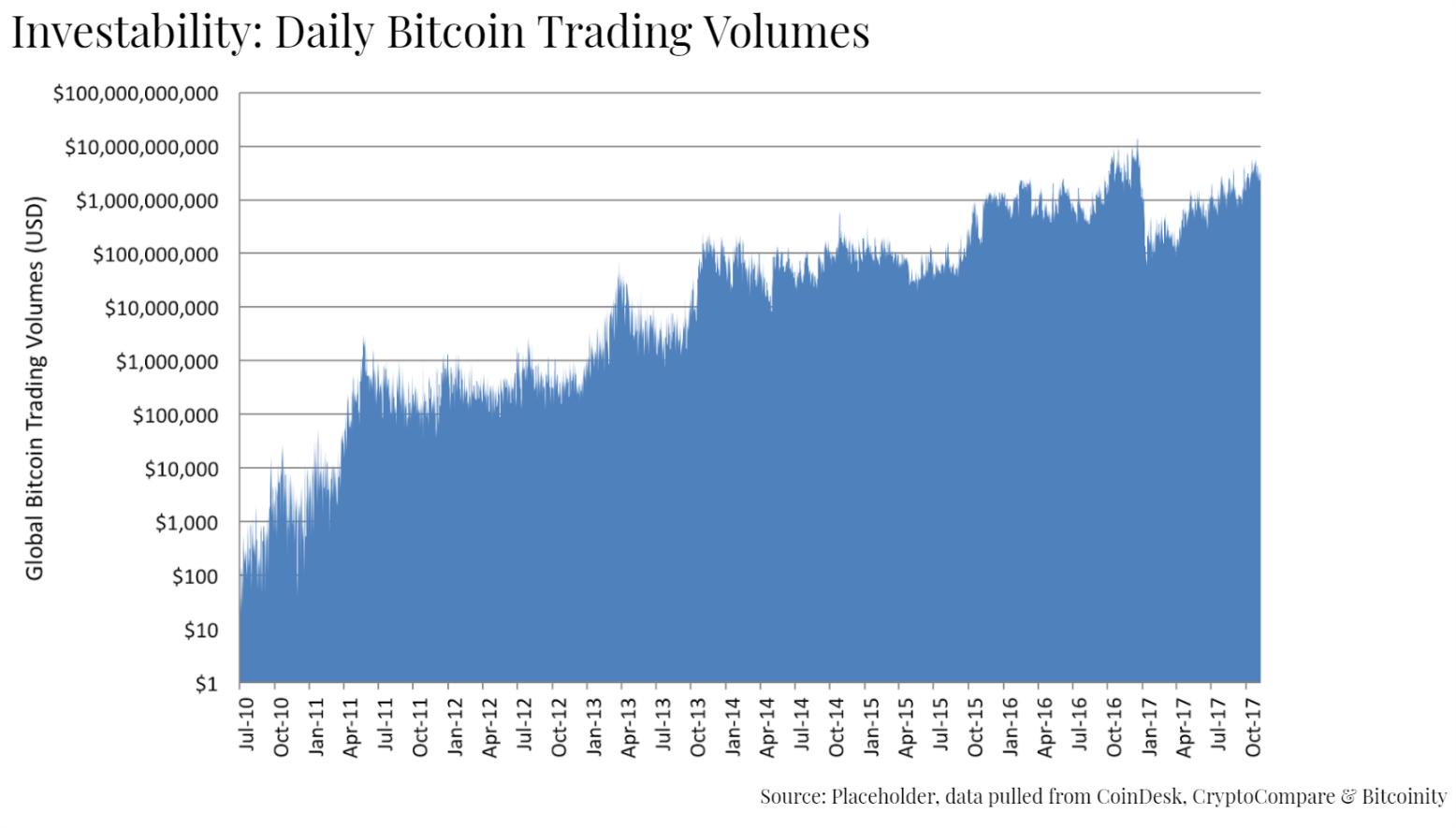 - Investability — is it liquid enough? There are currently $1 billion traded daily in crypto (my note: I’ll use crypto as an abbreviation for cryptocurrency in this post.)