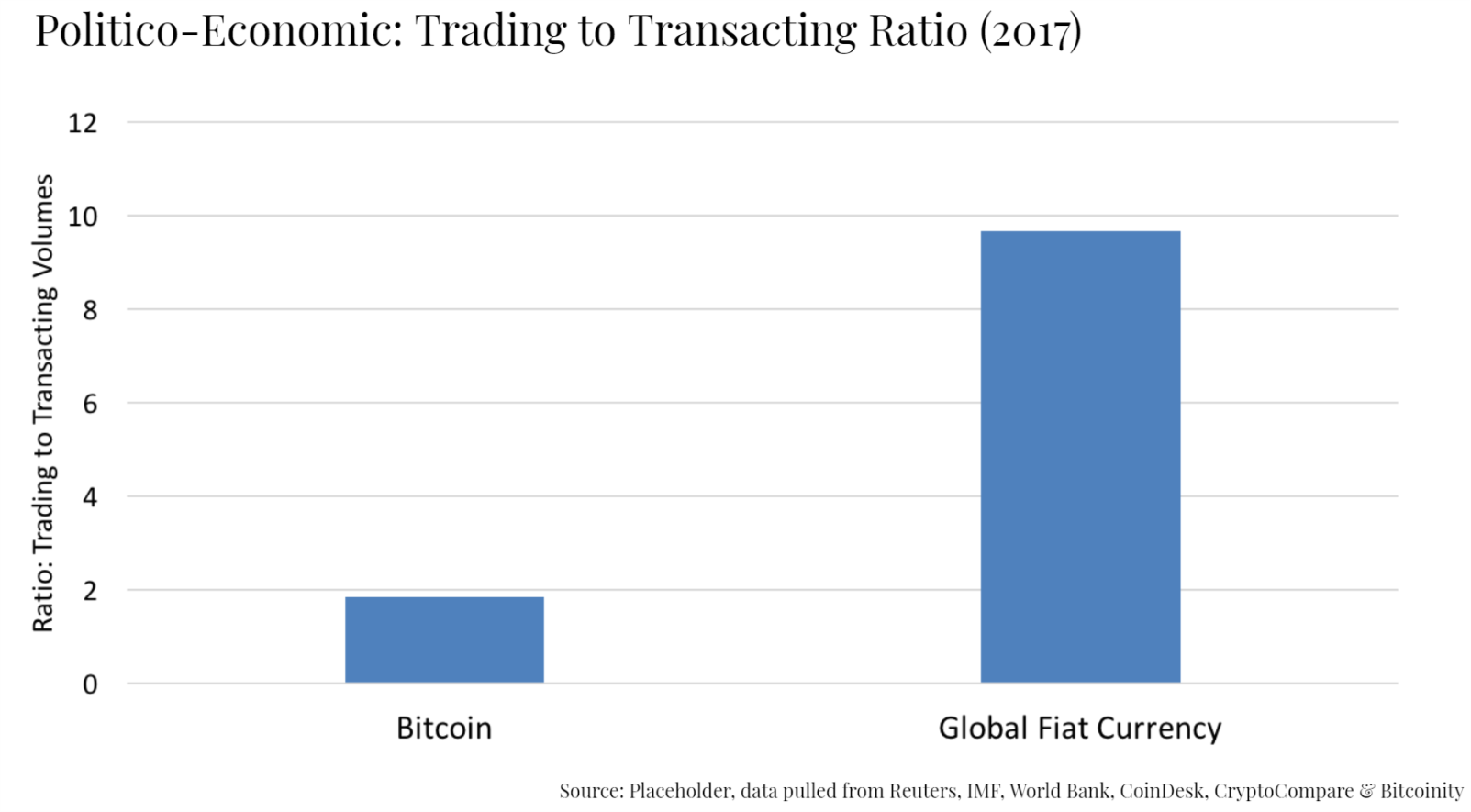 2.c. Trading to Transacting Ratio — Fiat currency is trading more than transacting relative to Bitcoin. This is probably driven by FX markets. As CME futures and other derivatives come online, there will be a lot more trading/speculating on Bitcoin than there is now.