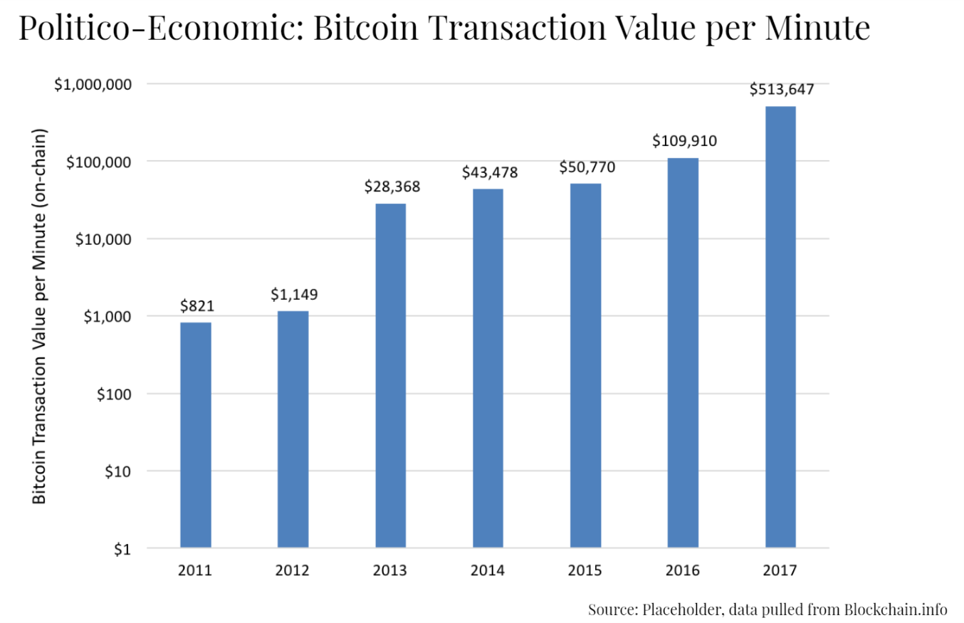 - More legitimate uses beginning in 2016 with sufficient transaction value per minute to qualify as an asset class