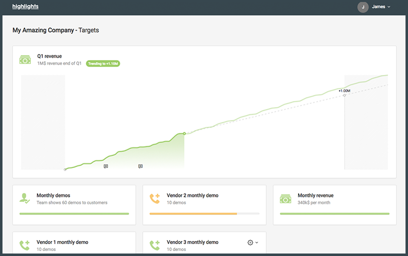 Within a week or so, we picked the name Highlights (as in Highlighting the important information ;-), incorporated the business in Delaware (Stripe Atlas), and set up a simple MVP (manual connection to data sources + visualization and sharing of objectives). I followed up with the entrepreneurs I had interviewed, and started “pitching”.