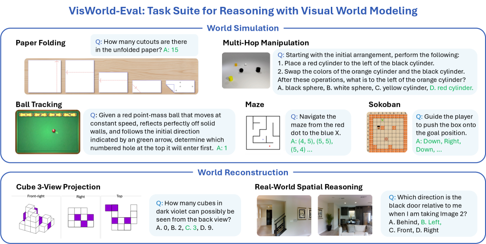 This is why the research introduces the VisWorld-Eval suite, a new set of evaluation tasks built from the ground up for this purpose. Seven tasks spanning both synthetic and real-world domains, each designed to isolate a particular aspect of world modeling. These aren't arbitrary benchmarks. Each task targets a specific atomic challenge that world models need to handle: tracking spatial relationships, predicting object dynamics, reasoning about physical constraints, planning paths with obstacles, understanding rigid transformations, reasoning about forces, and manipulating geometric configurations.