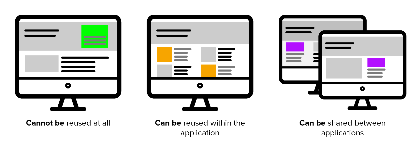 The middle ground is full of components that can only be reused within one application. Most components fall into this camp. Developers care about reusability and want to reuse their components again and again rather than re-inventing the wheel, but don’t want to put the effort into extracting those components and putting them in a library.