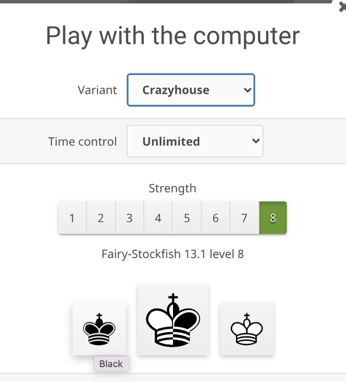 - Go to lichess.org and play crazyhouse against the lichess Stockfish computer