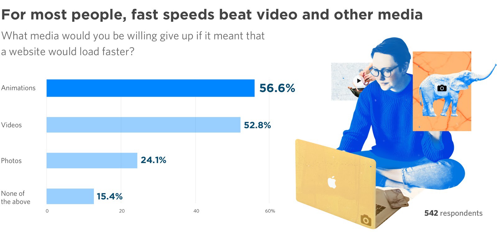 Consumers love beautiful animations and videos, right?? Turns out a slim majority of visitors don’t see much value in them if they’re going to slow down a web page. In fact, a quarter of consumers say they’d be willing to give up images as well!
