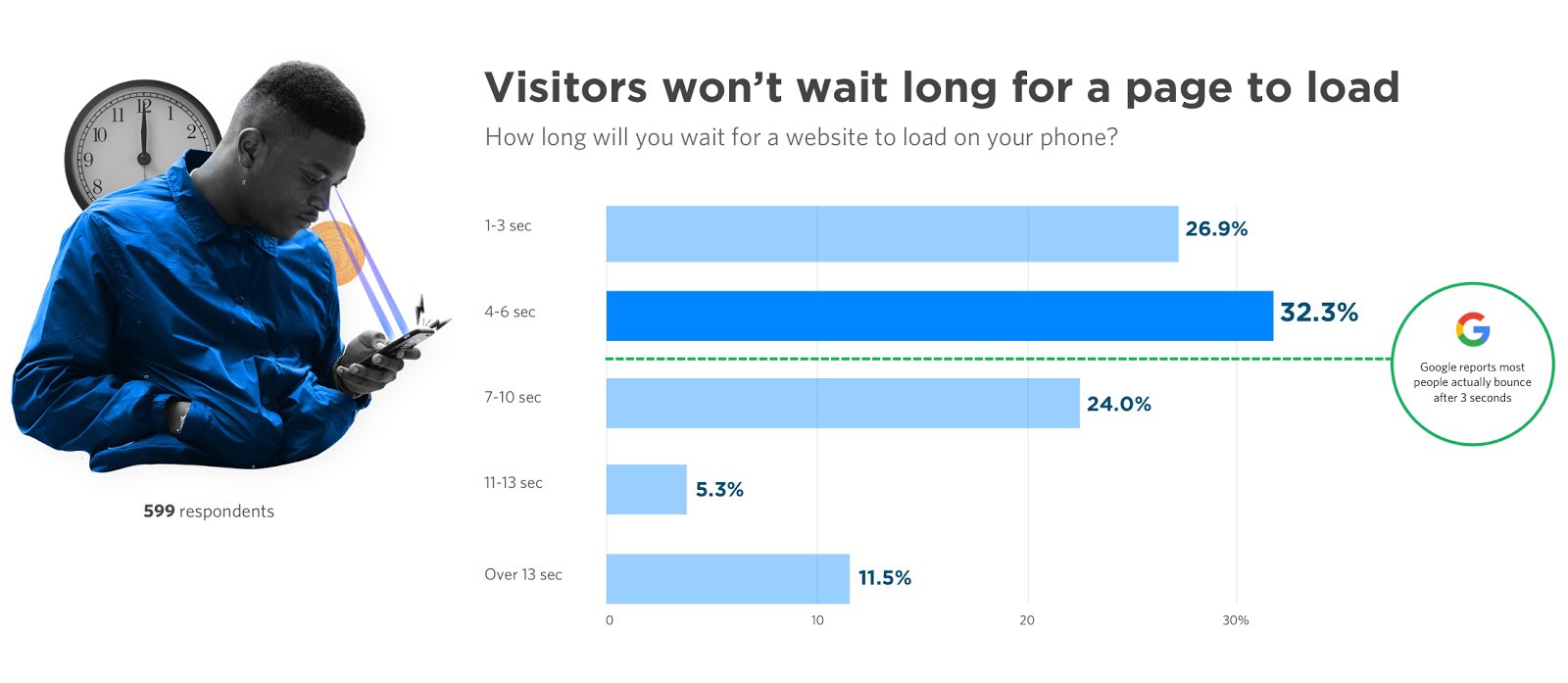 We asked 750 everyday people about how long they’ll wait for a web page to load and almost 60 percent said they won’t last more than 6 seconds. But that’s not what Google claims — actual user behavior shows most people bounce after 3 seconds. Turns out consumers think they’re a bit more patient than they really are.