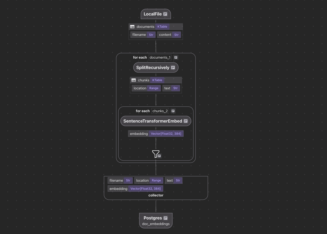 The function uses CocoIndex's built-in SentenceTransformerEmbed function to convert the input text into 384-dimensional embeddings The MiniLM-L6-v2 model is a good balance of speed and quality for text embeddings, though you can swap in other SentenceTransformer models as needed.