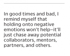 In good times and bad, I remind myself that holding onto negative emotions won’t help–it’ll just chase away potential collaborators, mentors, partners, and others. This takes effort, practice, and patience, but it’s crucial to cultivating an attitude that attracts support rather than repels it–especially when that’s hard to do.