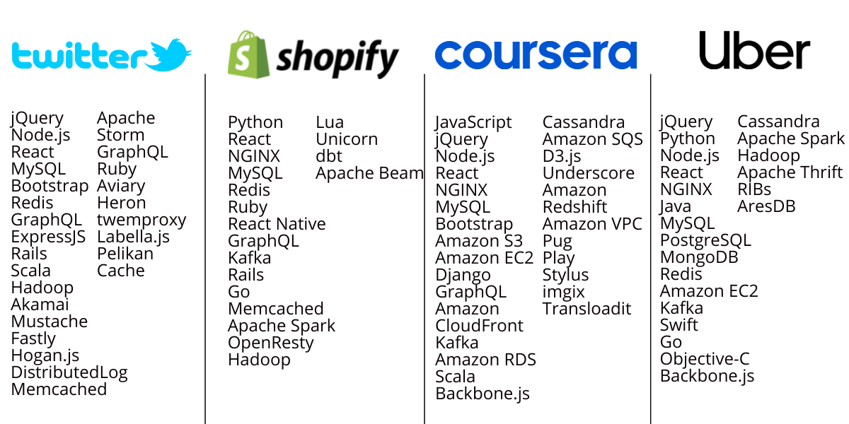 Instances of tech stacks from well-known companies are provided below. However, current consumption may evolve over time. These aren’t all-inclusive lists.