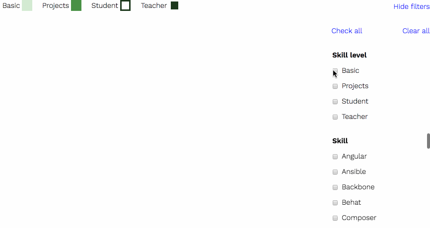 The inspiration for the two checkboxes filters (Skill level and Skill) is an online shop. Let’s say I want to buy a pair of new shoes. The starting point of my search is with every pair of shoes in the shop. I refine my search by type, then by size, and finally let’s say I want them in the colour blue. I now have a shortlist, from which I can examine the details of the pairs I like.
