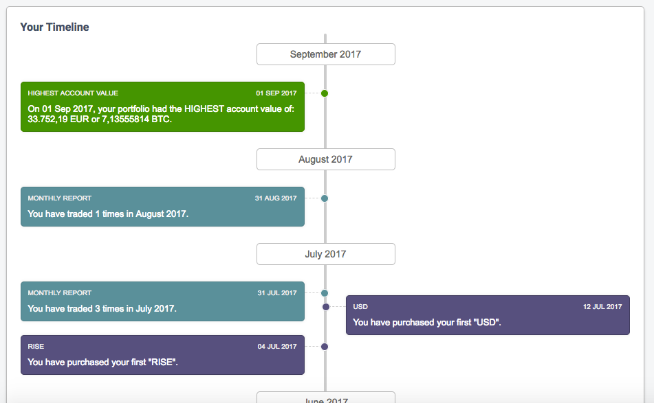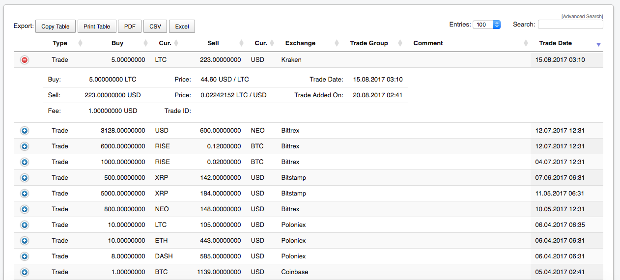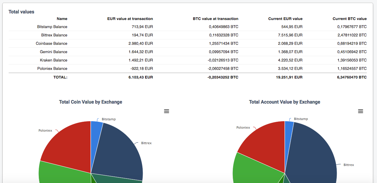 This gives you a quick idea of how your stash is distributed across the exchanges. When something is amiss or transactions seem to be missing, this view can give you a quick idea about which trades are missing.