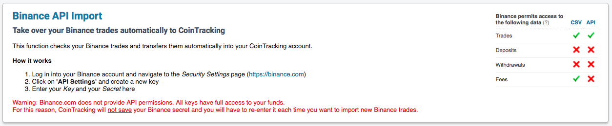 Be careful if you are using the API for syncing your trades. I would suggest enabling the APIs in the exchanges only after enabling the Two Factor Authentication(2FA) and make sure that you only enable the read access in the API. When I was trying to enable the API for Binance I realised that they have all or none access. So your API will either have both Read and Trade access or none. When I saw the API integration screen of Binance I could see the bold read warning message from Cointracking saying that they do not save the API secret key as it has trading access as well. This was good sign for me and my confidence in Cointracking increased after this incident. It is still foolish that Binance doesn’t have access restrictions on their API.